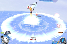 | パンヤの最も特徴的で実用的なショットがトマホークショットです。特徴は、図のように打った瞬間に爆発して飛んで行き、着地とともにまた爆発します。 打球の特性としては、通常ショットのキャリーとランの分をすべてキャリーで飛び、着地後停止します。(急な角度の面に当ると跳ねます)手前に海や川があって普通のショットじゃ落ちてしまう所や、高台にあって届きにくいグリーンも一気に捉えます。 |