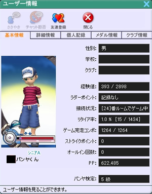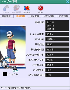 キャラ一覧などで右クリックするとそのキャラの詳細情報が見れます。 自分の成績よりも上回る成績の場合オレンジ色で表示されます。同点かそれ以下なら白文字のままです。 <ゲーム完走コンボ> ゲームを最後までちゃんとプレイした回数。リタイヤすると分子が10減ります。 <ストライクポイント> スキンスモードにて、対戦相手がゲームを中断し、リタイアした場合に+1Pointされます。ゲームを中断したユーザーは、-1Pointされます。 <オールイン回数> スキンスモードで対戦相手の所持PPを0PPにした回数。 |