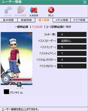 <ラッキー賞> 上位ランクと他の受賞者を除いたプレイヤーの中からランダムで選出される <ベストスピーダー賞> ボギーを出さなかったプレイヤーの中から一番早く大会を終えたプレイヤー。 <ベストランナー賞> ボギーを出さなかったプレイヤーの中から最も総飛距離の長いプレイヤー。 <ベストチップイン賞> 一番長いチップインを成功させたプレイヤー。 <ロングパター賞> 17y以上の一番長いパットを成功させたプレイヤー (17y以上が1人もいないと受賞者無し) <ベストリカバリー賞> Frontホールのスコアと、Backホールのスコアの差が一番大きいプレイヤー。(前半はスコアがよくなかったが後半盛り返したプレイヤーに贈られる)経験値が低いプレイヤーが優先される |