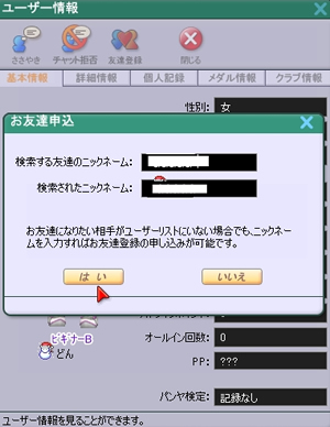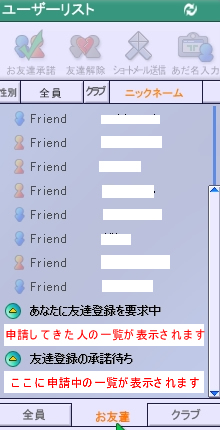 また、お友達申請をされた場合は、申請してきた人の一覧に表示されますので、対象キャラを選択して